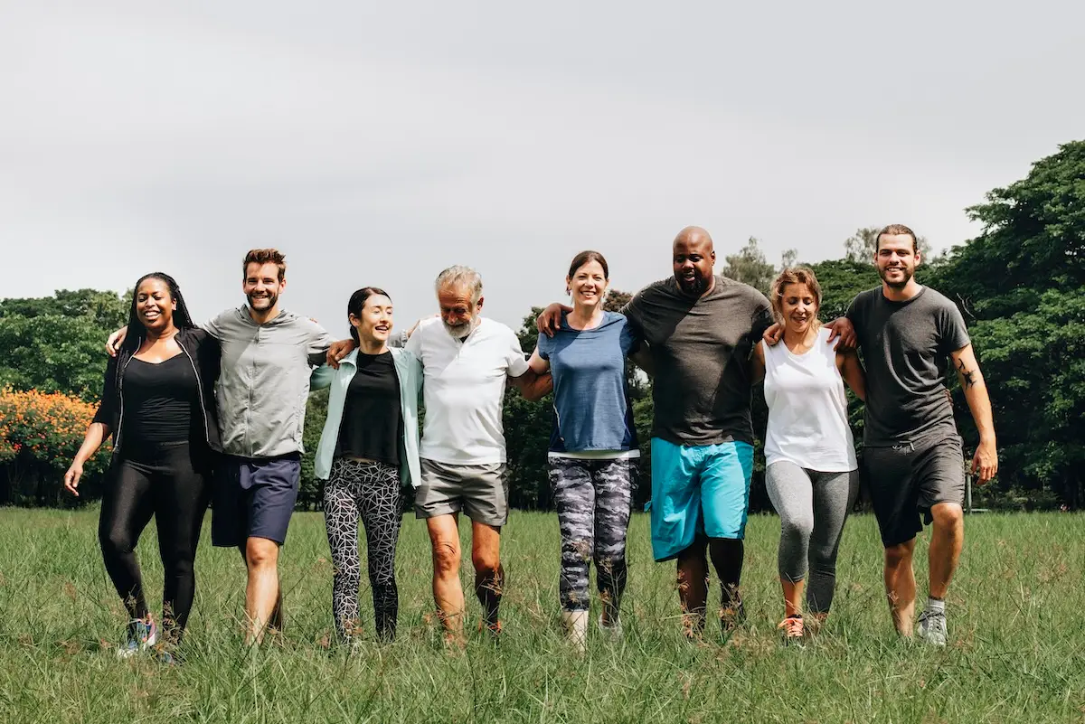 Several people sharing a group hug in a park, illustrating the concept of connection and boundaries in a healthy boundaries quiz.